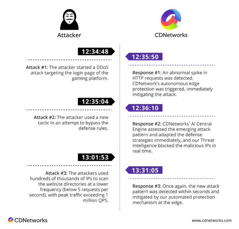 Dù kẻ tấn công có liên tục thay đổi chiến thuật ra sao, AI Central Engine – bộ máy trung tâm của nền tảng bảo mật CDNetworks – vẫn có thể tự động điều chỉnh chiến lược phòng thủ chỉ trong vài giây. Nhờ khả năng phản ứng linh hoạt này, máy chủ gốc luôn duy trì trạng thái ổn định, đảm bảo trải nghiệm chơi game của người dùng không bị gián đoạn. Dưới đây là timeline cho thấy cách CDNetworks đã xử lý một trong những đợt tấn công diễn ra vào ngày 1 tháng 10: