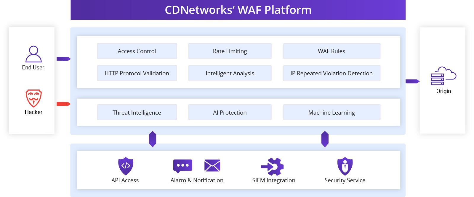 Ứng dụng công nghệ AI và machine learning, hệ thống tự động xử lý các sự kiện tấn công ngoại tuyến và tạo ra các chiến lược phòng thủ mới nhằm tăng cường bảo vệ cho hệ thống của bạn. Ngoài ra, WAF của CDNetworks được triển khai tại các edge node trên toàn cầu, giúp ngăn chặn các yêu cầu tấn công gần với nguồn phát sinh, từ đó củng cố thêm lớp phòng thủ toàn diện cho hạ tầng của bạn.